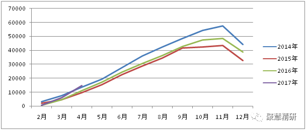季节性需求导致的供需缺口是否会重现 上一篇文章对供给端进行了定性分析,核心观点是受减量置换等政策影响,短期内月度产量将小幅缓慢增长,供给增幅有限。于是,需求成为判断动力煤价格走向的主要变量因素。由于研究的目的是要判断今夏动力煤的价格走势,所以下文的时间维度为9月之前。 也许是更熟悉供给端的原因,个人认为需求的分析要比供给困难。就动力煤而言,下游最主要的行业是电力,其次有建材、化工、冶金等。毫无疑问,发电量是影响动力煤需求的最主要因素,而且与经济繁荣程度成正比。从逻辑上推演,建材、化工、冶金等行业用煤也与经济增长和用电增速成正比。进一步向下游延伸,房地产是大多数工业品最重要的消费终端。 今年以来对房地产行业的宏观调控,使市场对三季度或下半年的需求十分担忧,不解决这个问题,似乎很难对需求有一个可信的判断。因此,作为一个外行,我花了些篇幅写下自己对房地产行业未来一个季度发展情况的理解。通过分析房地产行业的变化能够对电力及相关工业品需求总量的变化趋势进行预判,进一步要判断火电的变化,还需要分析发电量的构成情况,即水电对火电的影响。最终得到今夏以火电为主的动力煤需求分析结论,这便是本文的逻辑。 一、6-8月房地产新开工情况分析 受去杠杆、限购、限贷等政策影响,市场对房地产行业对经济的拉动作用都持看空态度,对动力煤1709而言,主要关心交割之前或者说8月底之前房地产板块对需求的拉动作用如何。作为业余选手如何分析房地产行业呢?我希望用最朴素的逻辑去看待它。 房地产相比其他行业的区别在于从购地、预售、建造、交房的周期相对较长。以成交量最大的商品房来看,购房到交房的周期一般为两年,如果加上前端开发的准备工作,这个周期应该在两年半到三年。期间对上游原材料行业的拉动主要体现在施工面积上。因此,从逻辑上讲房产销售数据的好坏,不会立刻反映在房产开发引起的原材料价格变化上,会有一定的滞后性。 在新开工面积增速较快的情况下,假设建设速度不变,新建项目数量超过竣工项目会导致存量在建面积增加,从而增加相关原料的日耗,带来日耗增量,日耗增量即是引起原材料价格波动的主要原因。下图整理了2014年至2017年4月逐月累计的新开工面积减竣工面积的累计数对比。 商品住宅新开工面积减竣工面积累计数对比分析图 上图中表达的最核心的内容是2017年前四个月累计新开工面积与竣工面积的差处于2014年以来的最高值,意味着新开工对需求的拉动处于2014年以来同期的最高值。接下来看看图像背后的数据: