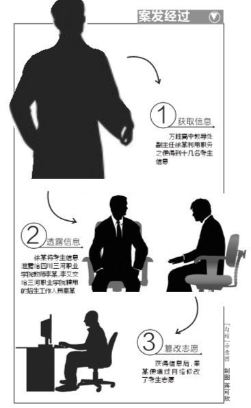 2016年夏天,高考成绩公布了。单县一中高三32班的插班复课生陈某的成绩并不是很好,强烈的妒忌心理和报复心理促使他篡改了班级四名同学的高考志愿。陈某一共进入了五个同班同学的报考系统,但到第五个同学的时候,他发现,这个人的分数比较低,这才打消了他改志愿的念头。 最终,陈某因涉嫌侵犯通信自由罪被刑事拘留,被判处有期徒刑7个月。五个人的命运也因此发生转折。 超出一本线30多分且服从调剂的小凡有可能被青岛科技大学录取,结果却上了山东理工大学。高出一本线19分的小朱很有可能被国家重点学校新疆大学录取,如今却上了烟台大学。一直梦想当警察的小田,很有可能被江苏警官学院录取,如今却成了潍坊学院免费师范生。而小徐也因志愿篡改,被山东女子学院录取。 老师:利益驱使 招生老师铤而走险偷改学生志愿 2012年,“万胜高中十余名考生志愿被篡改”事件同样闹得轰轰烈烈。6月29日,万胜高中共有十余名学生的高考志愿被“偷梁换柱”,且均为同一高校:四川三河学院。