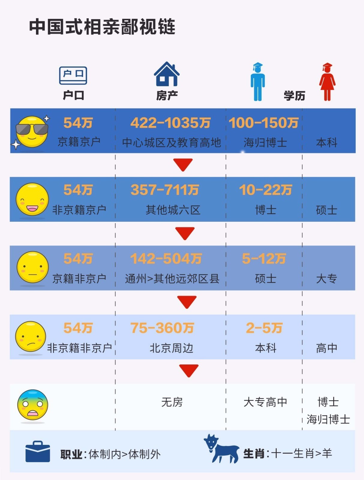 媒体在报道这件事时,选取的标题颇有意味“我儿子才33岁,不考虑没北京户口的姑娘”有户口残疾也行”。正文黑体加粗的部分的也有意思“你什么条件都好,要是不属羊我肯定选你当儿媳妇了…在相亲角,其他十一生肖永远凌驾于羊之上。大爷大妈对‘十羊九不全’的民间说法深信不疑,只要属羊,一律不考虑!”。一条清晰的相亲鄙视链在大爷大妈这些极端个例下产生了。“只考虑北京户口姑娘”的话题霎时在网络炸开锅。那些以前哪怕是挑选经济条件还不忘强调一下“人品好”“有孝心”的大爷大妈们,这次不仅将以前的“体面”卸了,甚至直接把婚姻拆解为户籍、房产、学历、收入、家庭背景等具象指标,明码标价。 “价目表”上的男女被划分为6个阶层,位居相亲链顶端的是有北京户口,有房有车,月薪数万的顶配阶层;居于末端是“三无”(无户口、无房、无车)外来低薪打工人员,他们被列入“不考虑阶层”,在二者中间根据户籍,房、车等指标,产生简配、低配、标配、高配阶层。每个人都在守卫自己所在的阶层,睥睨条件不如自己的,寻求相对高层次的家庭。在这里,婚姻以极其简单粗暴地方式被物化,功利化,沦为别有用心者实现阶层流动的跳板。一张经由网络发酵的“相亲价目表”,让相亲角里大爷大妈成为众矢之的。仿佛,是他们让婚姻染上铜臭味;没有他们,就没有这条相亲鄙视链。