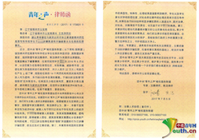 北京7月16日电 最近经常做噩梦,梦到别人拿着刀找我要钱。”提起前男友于某,任某哽咽道:“我现在就希望于某能把钱还回来,不再每天都过着担惊受怕的日子。” 近日,辽宁锦州师范高等专科学校女学生任某向“青年之声”发出求助称,自己被同班同学兼前男友于某利用身份,先后向14个网贷机构与民间高利贷借款22万元(利息仍在产生)。任某因无力偿还巨额贷款,担惊受怕,学习生活受到严重影响,曾一度想要自杀。而自4月10日起,于某失联至今。 日还3000元欠债22万元前男友失联 据任某介绍,2016年6月,于某在某网贷平台做代理,请任某帮忙在该平台上刷单。任某称,自己并不了解什么是网贷,“当时刷的是1000元钱,分三个月还,没有利息,我就刷了。” 任某将贷款转给于某的部分转账记录。任某供图 任某告诉记者,2016年8月末,任某与于某确定为恋爱关系,恋爱约一周后,于某便以朋友怀孕要需做人流手术为由,让任某网贷了1500元,而此次借贷有利息。 “到2016年12月的时候已经欠款7万多,我后来意识到网贷会利滚利,就跟他说,‘这钱不能再借了,已经太多还不上了’。但是他说,要是不替他借钱,之前网贷的钱他也还不上,相当于是借一笔还一笔。”任某介绍说。 任某说,2016年12月,自己与于某分手,此后,于某一直以各种理由要求任某帮其借钱,遭任某拒绝后,于某就威胁她。“我要是不借的话,他要把我贷款的事情发到学校贴吧,还说要把我的裸照发到网上。我当时非常害怕,就帮他借了。”。 任某称,2017年4月9日,于某要求任某帮其向民间高利贷借钱2万元,“我根本不知道高利贷怎么借怎么还,手续都是于某在张罗,我只需要去签个字,也不知道要还多少利息。” “第二天,高利贷就开始催我还钱,我才知道原来这次贷款每天都要还3000元。当天,我就联系不上于某了。”任某回忆说。 任某称,因为害怕,她不敢将事情告诉家长。直至今年4月10日于某失联后,走投无路的她将事情告诉家人,“于某失联后,我给他爸打电话,他让我找于某要钱,可是我根本联系不上于某。学校也跟他家人沟通过,但是他家人并没有任何处理。” 据悉,至今,网贷、高利贷借款已经达到22万元(利息仍在产生)。 “青年之声”发律师函 警方建议提起诉讼 团中央“青年之声”维权服务联盟就此事发出律师函。 对于上述求助情况,团中央“青年之声”维权服务联盟副主席、北京市律师协会宣联委主任、北京市帅和律师事务所主任、法学博士沈腾认为,本案具有校园类犯罪案件的典型性、特殊性,处理结果直接影响到教师、学生以及学生家长对学校的信任度,对社会类似案件的处理亦具有示范引导作用。7月11日,团中央“青年之声”维权服务联盟向辽宁省锦州市公安局发出律师函,建议锦州市公安局督促凌河分局马家派出所尽快立案调查此事。 7月14日,中国青年网记者致电辽宁省锦州市公安局。工作人员回应,“事件发生后,派出所对此高度重视,积极开展工作,先后多次做过调查。经过查证得知,当初在学校时,任某与于某是属于男女朋友关系。任某同意借给于某钱、帮他行贷,这些在派出所的调查中均有证明,没有足够证据证明任某是被胁迫替于某去办网贷的,因而不能构成于某诈骗或侵占的罪名,任某所述的情况不符合刑事立案条件。” 工作人员向记者解释,任某和于某目前属于个人经济纠纷,对此类案件,公安机关建议任某可以向法院提起诉讼予以解决。