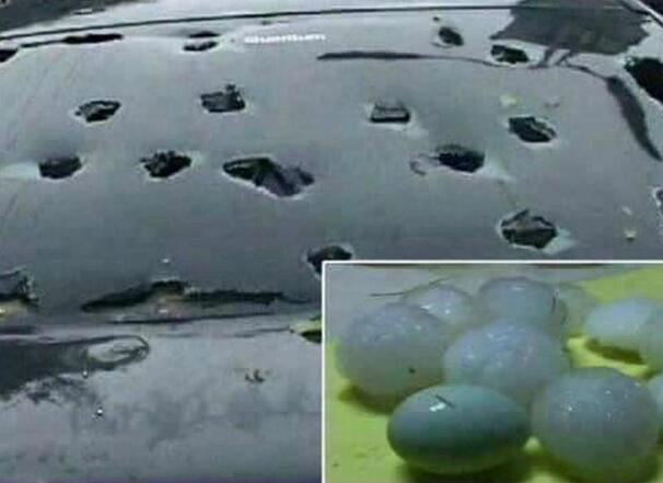 街道附近停放的车辆也没能逃过这次"天降横祸",这些车子的挡风玻璃被完全砸碎,车顶上被砸的和筛子一般,让人看着十分心疼。 这辆车的每个方位都被砸的坑坑洼洼,挡风玻璃全部都碎掉了,好像经历了大型车祸一般,不仅如此,当地很多树木和住宅的窗户都被砸的乱七八糟。