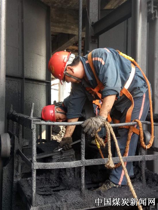 ![]() 双龙公司机电科运转队在施工前用备用楔形卡清理准备完毕,运送到主井上井口空地,同时将专用棚罐工字钢、氧气、乙炔等工具准备完毕并运送至主井井口空地。施工时先用棚罐工字钢穿过箕斗上平台下方将箕斗棚起,然后用标准棕绳将使用中的楔形卡预留,联系车房司机开动绞车将提升绳下放至钢丝绳落地,用氧气、乙炔在距楔形卡1.5米处隔断,再将备用楔形卡与提升绳连接。两勾提升绳截取方法一致,施工结束后运转队进行试运行,确保正常投入使用。