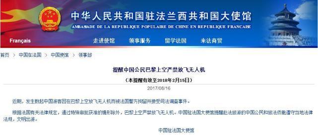 中国驻法国大使馆网站8月16日发布提醒,巴黎上空非经批准严禁放飞无人机,赴法旅游的中国公民和旅法侨胞应遵守当地法律法规,文明出游。