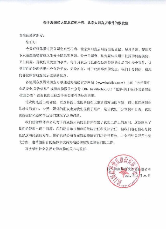 | 海底捞称被曝光后厨“问题属实” 致歉并承诺整改 | |||