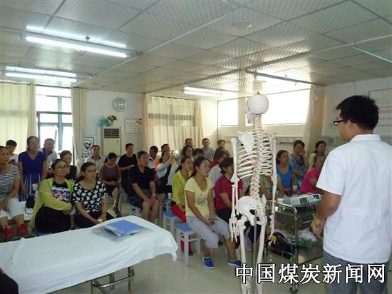 邀请康复专业人士讲授如何预防和治疗颈椎病知识,进行互动传授治疗方法,让老人老有所乐,回去后可以给家人按摩,同时教大家一套预防颈椎病保健操。并免费给大家诊断各种疼痛疾病、发放宣传纪念品,让职工和家属感受到组织的温暖和关怀。图为讲座培训现场