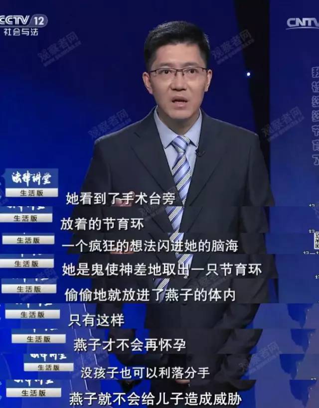 《我被婆婆节育了!》 CCTV12 频道《法律讲堂》最新播出的这期节目 简直是编剧都编不出来的可怕剧情! 大学毕业的儿子张洋爱上餐厅打工妹燕子,气坏了母亲张秀琴。为阻止儿子娶打工妹,身为护士的张秀琴做出了疯狂的事…… 事情的来龙去脉是这样的。 儿子张洋大学毕业后在一家公司做程序员,转眼,也到了谈婚论嫁的年纪。 张秀琴全款买下了一套商品房,一心指望着儿子能带回一个称心如意的女朋友。 然而,天不遂人愿,儿子喜欢上了公司楼下一家餐厅里的打工妹燕子。 儿子的新女友竟是个高中毕业的打工妹,张秀琴当时就急了,立即用命令的口吻对儿子说,“我不同意,你必须立即跟她断绝来往。” 热恋中的张洋自然是听不进母亲的话,既然家里容不下自己,张洋决定搬进燕子的出租屋里,开始同居的生活。 儿子的出走,让张秀琴整夜都睡不着觉。趁着周末,张秀琴来到燕子所在的餐厅,大声责骂燕子。 张秀琴甚至找了餐厅老板,警告他立即辞退燕子,否则以后天天来吵。 老板怕惹麻烦,于是辞退了燕子。 这一下可是惹恼了张洋,坚定了不回家的决心,儿子与母亲便开始了无限期的冷战。 直到一个月后的某一天,事情有了转机。 燕子怀孕了,张洋准备马上结婚。 这个消息让张秀琴听得是天旋地转。思来想去之下,张秀琴决定化被动为主动,假意同意让燕子来家里住。 儿子回家后,张秀琴便开始向他灌输“等条件成熟再要孩子”的思想。 儿子答应了,燕子也被说动了,于是,身为护士的张秀琴就趁着晚上没人,把燕子带进了诊所,亲自协助医生给燕子做人流手术。 在流产手术过程中,看着躺在手术台上的燕子,气上心头的张秀琴脑中忽然闪现出一个疯狂的想法。 取了一个节育环,偷偷的放进了燕子的体内。 张秀琴想,只有这样燕子才不会再怀孕。就算儿子跟她结婚,没孩子就可以利落分手。 被准婆婆节育后,燕子身体不适,张洋却不以为然,频频争吵的两人最终分手。 分手后张洋一蹶不振,工作不思进取、在家打游戏啃老。 张秀琴四处给儿子找女友,可没有女人看得上。 这时的张秀琴心生悔意,想起了燕子的好。但人海茫茫,到哪里去找燕子呢? 时间就这么过去了两年。 正当张秀琴一筹莫展之际,燕子竟自己找上了门。 原来,燕子与张洋分手后,就获得了一笔不菲的拆迁款,还进修了工商管理课程自主创业,并结识了现在的未婚夫。 未婚夫家要求燕子先怀孕后领证,可燕子因为体内有节育环无法怀上,因此找到了张秀琴,请她帮忙检查身体。发现燕子事业有成之后,张秀琴开始挑拨燕子与未婚夫的关系,让儿子乘隙而入。 未婚夫觉察后开始殴打燕子,最终导致燕子离开未婚夫,并与张洋复合。 燕子与张洋复合后,去了大医院做检查,终于发现了自己不能怀孕的秘密。 面对自己闯下的大祸,张秀琴竟还辩解称,这一切都是为了燕子好。 燕子气的直跳脚,愤怒的表示要将张秀琴告上法庭。殊不知却遭来张秀琴的威胁,称要曝光她未婚先流产的丑事。 燕子实在咽不下这口气,仍是将婆婆和张洋告上了法庭。 律师经过调查发现,张秀琴没有取得职业医师资格证书,不具备做人流手术的资格。经法医鉴定,张秀琴的行为对燕子的伤害构成轻伤。 我国刑法三百三十六条第二款规定,未取得医生执业资格的人擅自为他人进行节育复通手术、假节育手术、终止妊娠手术或者摘取宫内节育器,情节严重的,处三年以下有期徒刑、拘役或者管制,并处或者单处罚金;严重损害就诊人身体健康的,处三年以上十年以下有期徒刑,并处罚金;造成就诊人死亡的,处十年以上有期徒刑,并处罚金。 最终,张秀琴被判处有期徒刑6个月,并处罚金5000元。 判决生效后,燕子与张洋解除婚约。 张洋再次从燕子前男友的身份变成前男友,受到精神打击更加堕落,拒接探视牢内的母亲…… 不得不说, 生活的狗血可是一瓢一瓢地泼, 果真应证了那一句“艺术来源于生活”。 面对案例中这位戏精母亲,网友满肚子的愤怒。 爱之深,情之切,永远不能成为伤害他人的理由。