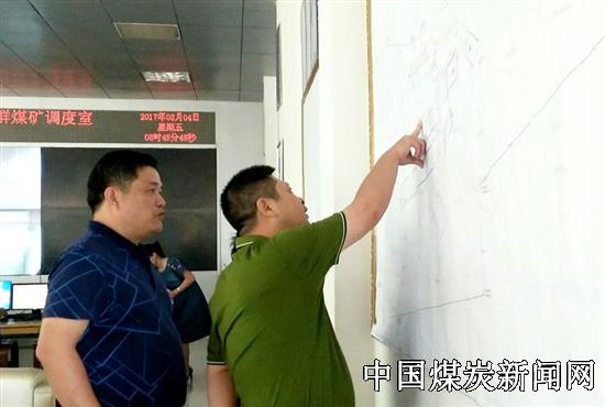 图为秦建亮总经理(右)和该矿矿长曾胜在查看采掘接替布置的情景 秦建亮总经理一行到矿后,在该矿矿长曾胜、副矿长黄福青等领导的陪同下,查看了原煤生产及库存情况,听取了该矿安全生产情况的汇报,对当前该矿生产中存在的问题进行了深入分析和交流。秦总经理要求,保群煤矿在搞好安全生产的同时,一定要保证煤炭质量,以质量促发展。矿领导班子要带领广大职工真抓实干,务求实效,努力完成公司下达的生产任务,为矿井的稳定发展作出贡献。