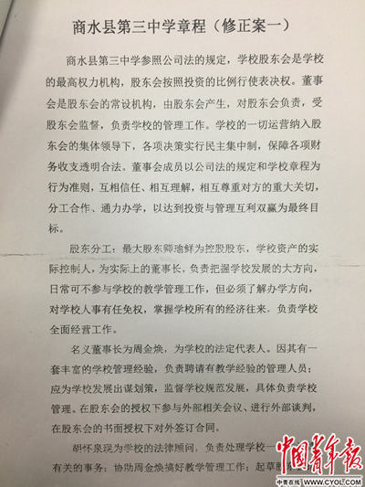 在商水三中,她叫卿红梅,管理层称她“卿会计”。曾经担任校长的何志杰说,“卿会计大会从不上台,但开不开这个会、谁坐主席台,都是她说了算。” 在与商水三中副校长胡怀泉签订的合同里、诉讼中,她又叫卿瑜鲜。 在商水县财政局,她叫张喜梅,一名公务员。本来在行政服务中心上班的她“请病假,已经有一年不来上班了”。 在商水县纪委的调查结论中,张喜梅有两个户口、领两份工资;在2017年周口市纪委的调查结论中,张喜梅有5个户口、领两份工资。她借给周金焕1400万元,接手商水三中。而张其实也没有多少钱,1400万元是多方筹集的。 而在举报者王希顺看来,有证据表明,张喜梅才是商水三中的实际控制人,周金焕只是“白手套”。假文件办出真证件,民办学校被歪曲成公办学校,荒诞的事层出不穷,却无法得到纠正,背后是无法斩断的手在操控。 毁约 商水位于河南省东南部,人口超百万。随着社会的发展,原有的两所高中已不能满足入学需求。 2003年3月10日,商水县人民政府与温州人陈震生签订《关于筹建河南省商水县第三中学的协议》,约定“学校享受国家、教育部有关民办学校的一切优惠政策和商水县招商引资所有投资优惠政策”,政府无偿划拨土地、每年投入一定数量的教育基金,支援学校建设,县教育体育局发文在全县范围内抽调教师等,陈震生负责投资,确保当年秋季学期招生。 此后,商水三中如期投入使用。2005年,周口市教育局颁发了《民办学校办学许可证》,同年,学校被评为“周口市社会力量办学先进单位”。2007年,商水三中被河南省民办教育协会评为“全国先进民办学校”。 2010年,商水三中再次取得了周口市教育局颁发的《民办学校办学许可证》,有效期自当年5月1日至2018年5月1日。 2012年,时年64岁的陈震生决定退出。4月9日,他与周金焕签订了《关于商水三中整体转让的协议书》。周金焕支付1620万元,取得商水三中董事会(陈震生)的全部股份。 2014年7月,商水三中聘请北京国培京师教育科学研究院副院长、河北英才集团董事长何志杰担任常务副校长。 何志杰对中国青年报·中青在线记者表示,自己在商水三中工作期间,工资待遇、工作安排都是“卿会计”决定,基本见不到周金焕。 2015年1月6日,周金焕与何志杰、胡怀泉、王中堂签订《股权转让合同》,“双方核实确定商水三中全部资产价值2600万元”,作为“商水三中全部资产的投资人及法定代表人、独资股东”,周金焕持有学校15.385%的股权(作价400万元),其余股份分别转让给何志杰、胡怀泉、王中堂(作价2200万元)。 何志杰等接手学校后,进行了一系列改革,学校面貌发生很大改变。新旧管理者之间的矛盾也逐步升级。 合同生效不足3个月,周金焕单方面毁约。 4月2日,周金焕强行退还何志杰股金1150万元。5月14日,周金焕向商水县人民法院(以下简称“商水县法院”)提起诉讼,请求法院认定她与何志杰等三人签订的《股权转让合同》无效,理由是“违反法律强制性规定”。 何志杰认为,合同是双方真实意思的表示,并未违反任何法律规定。“卿会计”是看到学校形势向好,认为转让亏了才反悔。 2015年8月6日,商水县法院一审判决《股权转让合同》无效。 8月15日,商水县教体局领导以商水三中无法自行解决内部矛盾为由,强迫校长何志杰及副校长王中堂、胡怀泉交出学校的管理权。何志杰等被扫地出门。 变性 何志杰曾对胜诉信心十足,白纸黑字的合同怎么可能说不算就不算了? 让他未曾想到的是,这个官司延宕了3年,他一败再败。更让他震惊的是,商水三中到底是民办还是公办,竟然都成了问题。 商水县法院一审判决认定:商水三中资产应包括商水县人民政府提供的建校用122亩土地、三中品牌无形资产及原告的校舍、桌椅、电教设备等。其财产共有人为商水县人民政府和周金焕。原、被告的转让股权包括了与校舍不可分割的商水县人民政府提供建校用的土地,其转让合同未经商水县人民政府同意,擅自处分了共有人的财产,该转让行为违反了法律规定,属无效民事行为。 何志杰、王中堂、胡怀泉向周口市中级人民法院(以下简称“周口中院”)提起上诉。2015年10月30日,周口中院裁定,商水法院程序违法,撤销原判,发回重审。 商水法院追加商水县教体局为第三人参加诉讼。 何志杰等认为,政府为民办学校划拨土地、选派公办教师、进行财政支持是政府的职责和义务,商水县政府对三中的上述支持不是政府投资行为,政府不能因支持民办学校而成为学校财产的共有人。 2016年3月22日,商水县法院作出重审判决,再次确认《股权转让合同》无效,理由增加了一条:商水县教体局不同意转让。 何志杰等不服,向周口中院提起上诉。 2016年6月23日,周口中院判决驳回上诉,维持原判。 与商水法院判决不同,周口中院认定合同无效的重要依据是一份商水三中的“事业单位法人证书”。商水法院一审重审时,该证书已提交给法庭。 商水县事业单位登记管理局颁发的“事业单位法人证书”显示,商水三中的经费来源为财政补助,开办资金3000万元,举办单位为商水县教体局。 周口中院认定,根据商水三中的事业单位法人证书,“应当认定商水三中的举办单位是商水县教体局,而不是周金焕,周金焕无权将商水县教体局举办的第三中学的法人财产予以转让,其转让行为属于无权处分。” 至此,商水三中被认定为公