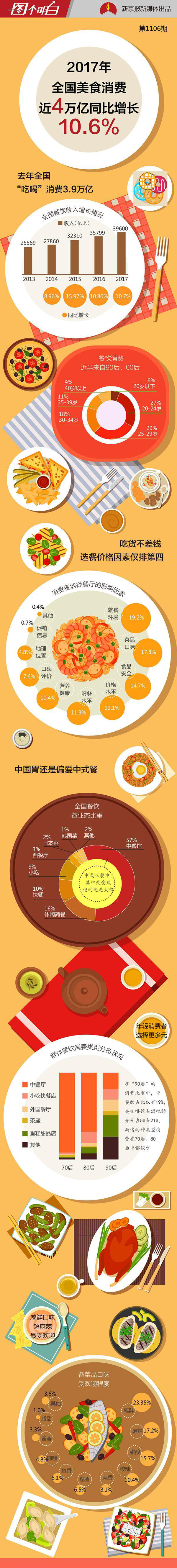 英国小龙虾、美国牛蛙、丹麦生蚝……每当外国生物泛滥,中国吃货就会想着怎么做出点“贡献”。2017年中国吃货确实贡献不少。据中国烹饪协会统计,2017年全国餐饮收入预计超过3.9万亿元,同比增长达10.7%。 过去一年中国吃货们不仅吃的好,还吃得讲究。中国烹饪协会发布的《2017年度美食消费报告》显示,这一年,消费者在选择餐厅时,最关注的因素是就餐环境,占19.2%;其次是菜品口味,占17.8%;食品安全因素排在第三位,占14.7%;而价格因素仅排在第四位,人们已不再满足于吃饱,还要享受吃的过程。 在菜品口味选择上,中式正餐占据强势主导地位,占餐饮消费市场的一半以上。不过,不同年龄段对菜品口味的选择也有变化,92%的70后消费群体对传统中餐情有独钟,而90后的这一比例仅为19%,年轻一代的选择更为多元化。