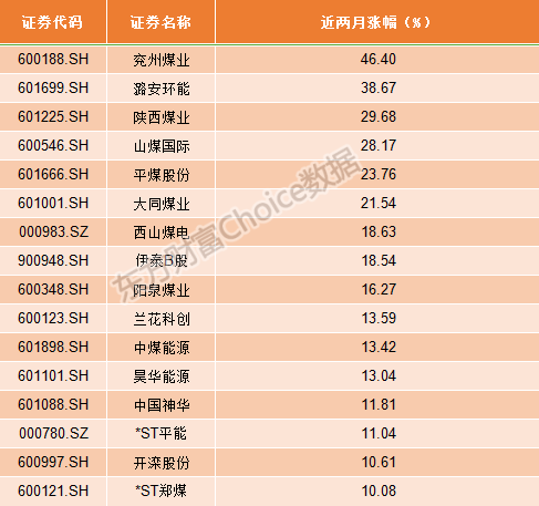 近两个月涨幅靠前的煤炭股中,兖州煤业大涨46.40%,潞安环能也涨了将近40%。
