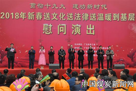 演出前,何开金代表广元市总工会发表了热情洋溢的讲话,他说,此次慰问演出活动,旨在宣传党的十九大,感谢广旺员工一年来对广元发展作出的贡献,也为了在新年伊始,提升员工群众爱岗敬业、开拓创新、勇于进取的精气神,传递正能量,增强凝聚力,祝福员工居民新春快乐,新时代里生活更幸福!张永致辞,向冒着寒风、不辞辛苦来到广旺矿区慰问演出的领导和演员们表示热烈的欢迎和衷心的感谢!