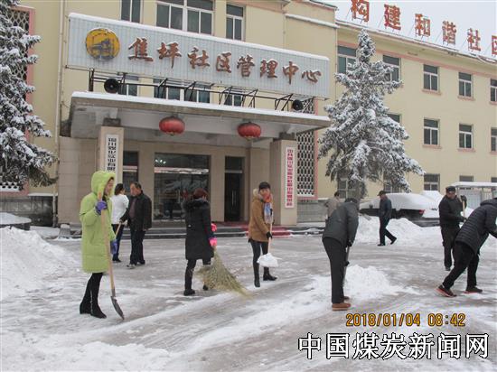 陕煤铜川实业焦坪社区管理中心组织机关全体工作人员和物业公司人员迎风冒雪对办公大楼、公路两边人行道、家属区清扫积雪,疏通道路。大家迎着严寒,边铲雪、边清扫,不亦乐乎,经过两个多小时的努力,清理出一条400多米长的道路,为群众清出了一条“安全路”。