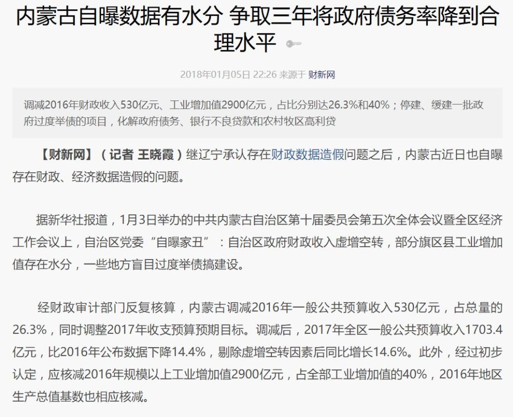据新华社报道,继辽宁省自曝财政数据造假之后,内蒙古自治区也自曝财政收入虚增空转。近日举行的内蒙古全区经济工作会议上,自治区党委“自曝家丑”,称“自治区政府财政收入虚增空转,部分旗县区工业增加值存在水分”。 此外,内蒙古还叫停一批政府过度举债项目,称争取用3年时间把政府债务率降到合理水平。 ▲财新报道截图。 目前看,内蒙古经济注水很难说只是“微乎其微”,这从相关目标的调整力度中就能看出大概:经财政审计部门反复核算后,内蒙古调减2016年一般公共预算收入530亿元,占总量的26.3%;核减2016年规模以上工业增加值2900亿元,占全部工业增加值的40%。可供参照的是,去年年初辽宁公开的部分市县经济数据掺了20%到30%的水分。 经济数据注水的危害性无需赘言。从全国来看,无论是GDP注水,还是财政收入虚增空转,都难言是个别地方的特有现象。去年12月审计署公布的2017年第三季度国家重大政策措施贯彻落实情况跟踪审计结果中,4个省份的10个市县(区)虚增财政收入就达15.49亿元。 水分越大,越需要公开坦承的勇气。面对“家丑”,内蒙古没有掩盖,而是主动揭开伤疤,这展示的是正视问题的态度。在此希望,更多地方能跟上步伐,主动戳破经济数据的泡沫,向民众和国家交出经济数据的“实底”。 ▲2016年内蒙古人均GDP过1万美元。 地方经济数据造假的原因和动力,很难简单归因,但根本上讲,仍是过去“官出数字、数字出官”畸形考核机制下的产物。 之前的十九大报告已定调,我国经济已由高速增长阶段转向高质量发展阶段;而未提及未来GDP翻番的目标,也已向淡化GDP总量考核发出了明显信号。国务院2014年公布的《关于深化预算管理制度改革的决定》,也将收入预算从约束性转向预期性,要求根据经济形势和政策调整等因素科学预测。 这些都在直接弱化有些地方经济数据方面造假的动力。接下来,建立和完善与“高质量发展”相配套的地方官员考核制度,也很重要——如果说,优化官员考核制度、深化预算制度改革,是从正面减少官员造假现象,那加强经济统计和审计监督,严肃落实相关问责制度,则是必要的反面激励建设。 辽宁、内蒙古的经济数据造假被正视并公开,就跟经济进入新常态、相关审计和财经纪律执行力度加大等大背景有关。但有效的经济数据统计监管,不能等造假问题严重后自动暴露。此前辽宁公开的造假时间从2011年持续至2014年,时间跨度不短。这更说明,严肃经济数据审计,健全预防机制,容不得懈怠。 不可松懈的还有追责之弦。2017年初召开的贯彻落实《关于深化统计管理体制改革 提高统计数据真实性的意见》座谈会明确提出,要切实加强对领导干部统计工作的考核管理,对统计造假、弄虚作假的,实行“一票否决制”。期望以后官员因统计造假而被追责不再罕见。 挤干数据水分,铲除过去发展中留下的泡沫,是迈向高质量发展的筑基之举。涉事地方敢直面经济数据不实问题,向造假“亮剑”之时,就已是疗伤之始,而有了这样直面问题和勇于纠错的担当,确保不想、不能、不敢造假的制度设计也势必会更好地落地。