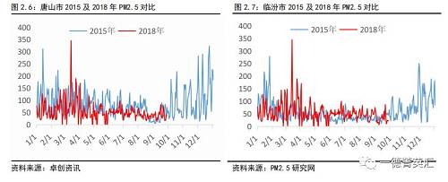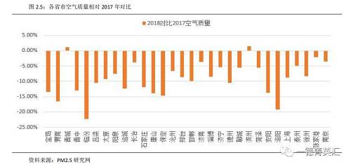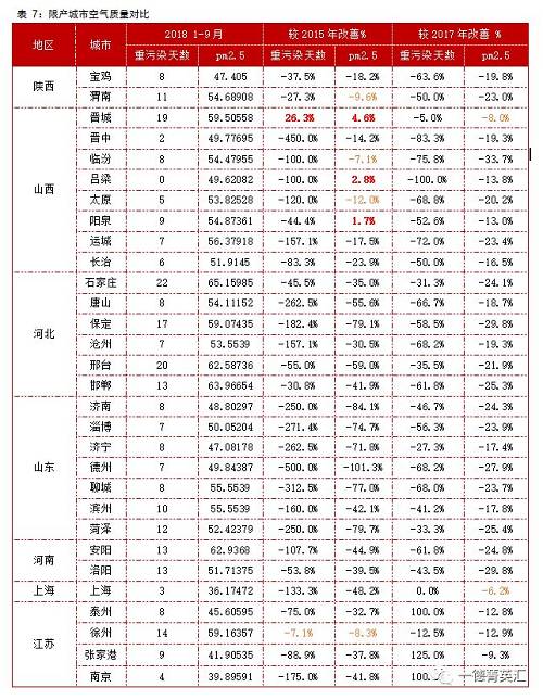 上面图标为汾谓平原,2+26及长三角地区重点城市空气质量情况。数据显示,大多数城市空气质量较2015年均出现明显好转,但山西晋城、吕梁等地空气质量有所回落;同时,也有少数城市改善力度相对较小。而与2017年相比,空气PM2.5指标均下降3%以上,但也有南京等城市改善力度较小。考虑到四季度是空气污染较为严重的时间段,前期空气质量变差或者改善较小的城市(晋城、滨州、张家港、长治),在后期或将面临更严峻的环保压力。