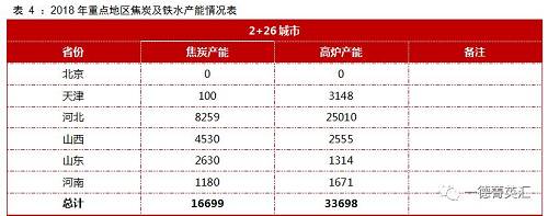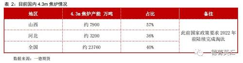 后期焦炭产能变化的重点,仍在于对于4.3m焦炉的淘汰工作。根据环保文件要求,河北及山西主要产区的4.3m焦炉服役超过10年的,需在2020年前淘汰。而2008 年 12 月 19 日,中华人民共和国工业和信息化部公告产业〔2008〕第 15 号发布《焦化行业准入条件(2008 年修订)》,自 2009 年 1 月 1 日起实施。其中规定:新建顶装常规机焦炉炭化室高度必须6.0 米、容积38.5m3;新建捣固焦炉炭化室高度必须5.5 米、捣固煤饼体积35m3,企业生产能力 100 万吨/年及以上。从这个文件可以理解 4.3 米焦炉基本是 2009 年之前建设的,到 2018 年底基本都已经达到 10 年服役水平。 再来看一下目前 4.3 米焦炉产能,2016 年我国 4.3 米及以下焦炉产能占比 48.1%,而从2016 年起,淘汰退出的产能也基本都是 4.3 米或半焦炉。截至 2018 年年初 4.3 米焦炉大致在 2.4 亿产能,山西和河北占据 1.1 亿吨。