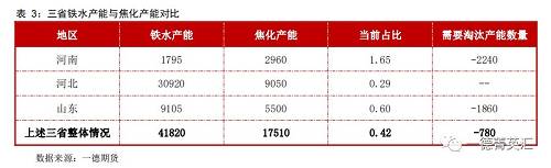 目前各地并没有统一的淘汰或置换方案,但是根据山西地区调研情况显示,山西地区4.3m焦炉置换规则相对宽松,焦企可以先建成新产能并投产后,再将原有产能关停,因此生产及预计不会受到较大影响。其他地区暂无相关政策,但预计或与山西地区政策基本类似。 不过由于采取减量置换的方式进行,据找焦数据统计,预计山西地区4.3m焦炉置换完成后,焦炭总产能将在2020年前后减少900万吨左右。 环保文件中另有要求,京津冀及周边地区铁水及焦炭产能将按照0.4的比例进行配置。以下是当前当地整体钢焦比例情况。(下表均为万吨)