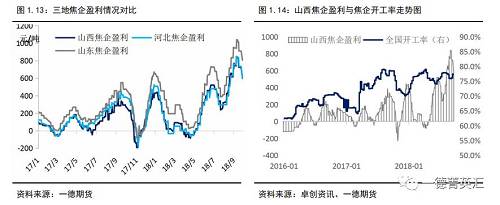 1.3 利润对煤焦供需的影响 三季度焦企盈利能力再次攀升,最高时主产区平均盈利达900元/吨左右,山东地区部分焦企接近1000元/吨。高利润继续支撑焦企开工率高位,最高时全国独立焦企开工率达78%左右,日产焦炭最高约126万吨。尽管9月出现下跌,但焦企整体盈利能力仍达到近两年来相对高点,继续对焦企生产积极性形成极大支撑。