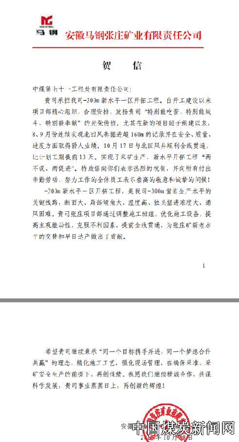 【本网讯】日前,安徽马钢张庄矿业有限责任公司发来贺信,祝贺中煤七十一处张庄项目部顺利完成-300米新水平与北回风井贯通工作。