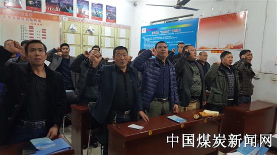 【本网讯】徐矿集团新疆赛尔能源公司为加强年末岁初的职工教育,强化班前会管理,规范程序,切实通过班前会教育提高职工的安全意识,图为综采一区职工班前会后进行安全宣誓。