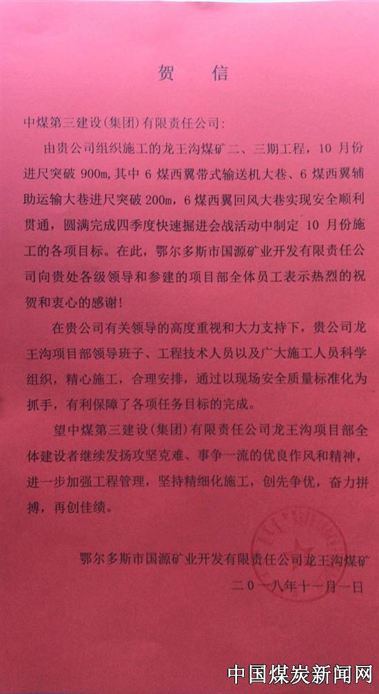 【本网讯】 近日,中煤七十一处龙王沟项目部10月份进尺破900米,圆满完成月度工作计划,喜获国源矿业开发有限责任公司贺信。