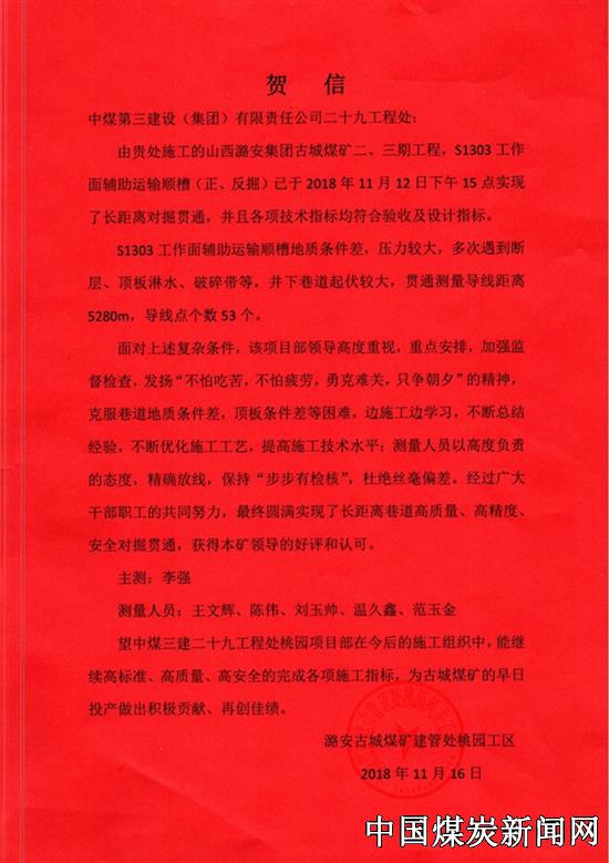 【本网讯】日前,山西潞安矿业(集团)有限责任公司古城煤矿建设管理处桃园工区向中煤三建二十九处发来贺信,祝贺该处桃园项目部承建的S1303工作面辅助运输槽(正、反掘)实现长距离对掘贯通,并且各项技术指标均符合验收及设计标准。