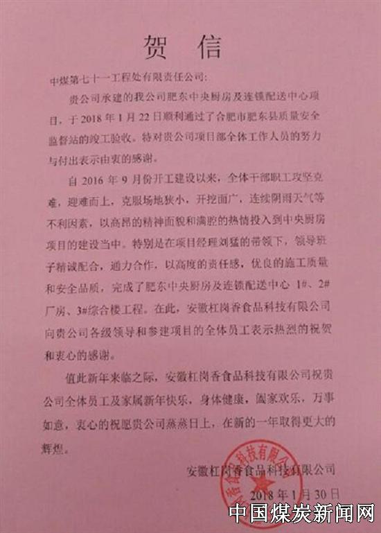 | 安徽杠岗香食品科技有限公司向中煤七十一处发来贺信 | |||