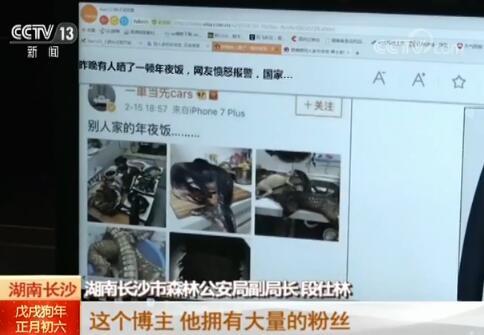 2月15日除夕夜,一账号为“一车当先cars”的微博博主饶某顺发布了一条名为“别人家的年夜饭”消息,并配发一组摆放在厨房里待烹制的熊掌、穿山甲等野生动物照片,引发网民的广泛关注。事后经当地警方证实,饶某顺 所发的为网络上下载图片。目前,饶某顺因虚构事实 扰乱公共秩序被行政拘留五日。 上图就是除夕夜,饶某顺所发布的微博和配图。这一条微博发布后,引发网民广泛关注和转发。当晚21点多,国家林业局通过官方微博予以回应,向广大网友征询图源或线索,同时,通报当地森林公安机关进行查证。 湖南长沙市森林公安局副局长 段仕林:我们接到舆情通报之后,在2月16日我们长沙市森林公安局就组织了警力进行了调查。2月17日晚,发微博的这个对象,迫于法律的压力到湖南省森林公安局来投案,来说明情况。 饶某顺交待,除夕夜当晚,他从网络上下载了5张野生动物的图片,未经过核实在微博上发布。 湖南长沙市森林公安局副局长 段仕林:这个博主他有大量的粉丝,就我们了解他有28万粉丝。他发布这些信息,实际上他就是为了博取粉丝的阅读量,但是发布之后引起了广大网民的关注,造成了恶劣的社会影响。 18日,根据《中华人民共和国治安管理处罚法》第25条第一款规定,饶某顺因虚构事实 扰乱公共秩序 被当地公安部门 处以行政拘留五日的处罚。目前,警方正在追查涉案图片来源。 湖南长沙市森林公安局副局长 段仕林:我们正在组织警力对图片的来源进行调查,如果发现这些照片所显示的涉及到野生动物这一块有违法犯罪行为,我们会坚决查处。