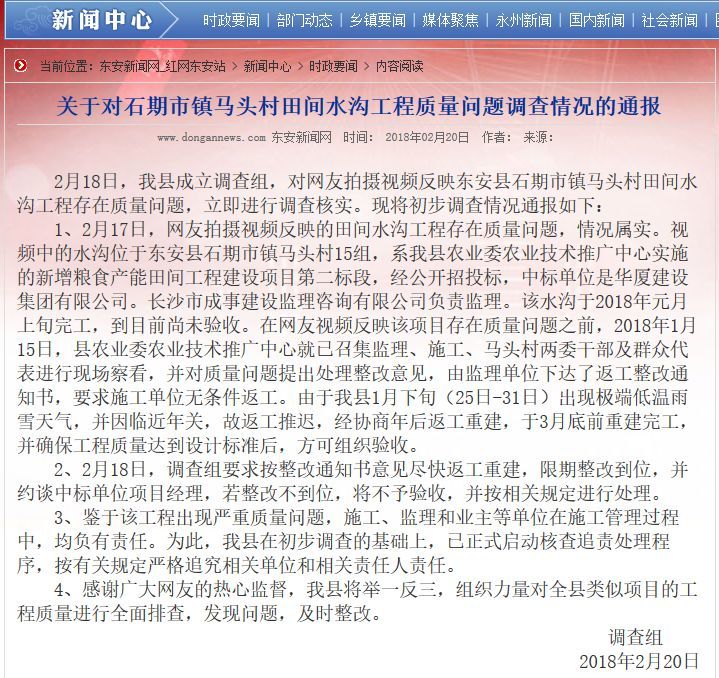 现场整改图片 原标题:关于对石期市镇马头村田间沟渠工程质量问题的整改处理情况通报 2月17日,获知网友拍摄视频反映石期市镇马头村田间沟渠工程质量问题后,我县立即开展调查核实处理整改,并对相关责任单位和责任人进行问责处理。现将情况通报如下: 一、项目基本情况 视频中的沟渠位于东安县石期市镇马头村,系东安县农业技术推广中心负责实施的新增粮食产能田间工程建设项目第二标段。该项目于2016年12月1日在永州市公共资源交易中心进行公开挂网招投标,中标单位是华厦建设集团有限公司,中标价为136.78万元。该沟渠结构为现浇砼,深为0.4米,底宽为0.4米。工程由长沙市成事建设监理咨询有限公司负责监理。该项目于2017年1月开始动工,目前尚未组织验收。 二、整改工作情况 2018年2月20日,施工队伍组织施工设备、原料和施工人员进场,对质量不合格沟渠全部拆除,并同步进行重建(拆除重建照片附后)。业主单位县农业委安排专业技术人员及马头村两委安排专人,驻守工地,会同监理人员进行全程质量监管,确保严格按照设计规范施工,确保3月底前保质保量完成整改重建任务。 三、问责处理情况 一是对负有直接责任的施工和监理企业进行处理。向上级呈报降低施工单位华厦建设集团有限公司水利建设资质等级,降低监理单位长沙市成事建设监理咨询有限公司的企业资质等级。向上级行政主管部门呈报,依法按规定将上述两个企业列入东安建设领域黑名单,停止两个企业在东安县内的招投标活动。依法按合同约定,对施工方和监理方进行相应条款约定的经济处罚。 二是县纪委县监察委迅速立案调查,启动问责程序,对业主和主管部门相关责任人进行问责。免去蒋笃刚县农业委党组书记、主任职务(按程序办理),免去谭德远县农业委综合调研股股长、项目负责人职务,免去谭德洲县农业委项目办副主任职务;给予蒋笃刚、谭德远党内严重警告处分;给予谭德远、谭德洲和县农业委项目办工作人员何少锋降低岗位等级处分。 我县将深刻汲取教训,直面问题,举一反三,对工程项目建设进行全面排查整改,一经发现工程建设领域的质量问题,以零容忍的态度,严查严处,坚决打击违规违纪行为,决不姑息。欢迎大家继续监督和帮助我们的工作。 调查组 2018年2月25日 相关报道: “手捏成渣”的水渠是如何建成的? 中标单位、监理单位,恐怕难辞其咎,这当中的责任,都必须一一厘清。 据新华社报道,近日,一则关于“湖南省东安县新建水渠形同豆腐渣”的视频,在网上引发热议。视频中水渠混凝土用手一捏就碎,不少网友质疑这条新建水渠存在严重的质量问题。东安县方面2月20日回应称,经调查核实视频反映情况属实,水渠确实存在质量问题。 “手捏成渣”是豆腐渣工程无疑。记者调查得知,此水渠系东安县农业委农业技术推广中心实施的,系新增粮食产能田间工程建设项目的一部分。此前经公开招投标,中标单位是华厦建设集团有限公司,长沙市成事建设监理咨询有限公司负责监理。此工程于2018年1月上旬完工,目前尚未验收。 ▲东安县的回应。来源于东安新闻网。 试想,若不是“好事者”拍摄了视频上传网络,不知道这样的“豆腐渣工程”日后会给当地农民带来多大问题?水渠作为农田基础设施,对当地农民而言,相当重要。而“一捏就碎”,可以想象背后的安全隐患,如此施工,岂不是对农民的糊弄? 尤其是,在当下实施乡村振兴战略的进程中,这样对待涉农项目,不仅会使国家财政的钱白白打了水漂,更会直接侵害广大农民的切身利益。 视频被网络曝光后,2月17日东安县成立调查组,要求施工单位尽快返工重建,限期整改到位,并正式启动核查追责处理程序。在舆论的关注下,想必水渠会以“崭新”的姿态面世,也会有一批官员和责任人被追责。但这其中的时间和财力成本无疑是巨大且无辜的。 “手捏成渣”水渠更像一面镜子,既可以照出一些单位的不作为,又能照出一些部门和企业的唯利是图,更可以照出乡村振兴进程中存在的诸多问题。而要解决这些问题,既要不得花拳绣腿,更须对虚假招式零容忍、严打击。 因此,有必要追问,“手捏成渣”的水渠是如何建成的?一方面,中标单位、监理单位,恐怕难辞其咎,这当中的责任,都必须一一厘清。另一方面,在问责之后,如何重建“阳光工程”的良性生态,避免“如果不是因为曝光”的尴尬之问,同样重要。