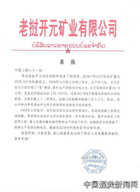 【本网讯】日前,中煤七十一处老挝开元项目部在1月份的施工中,原矿生产和充回填工程再创佳绩,创造了新的纪录,喜获甲方贺信。