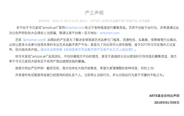 币圈风声鹤唳。 2月4日,行业垂直媒体有币网报道,此前已在境外交易所ICO 的项目ARTS 被投资人联合举报涉嫌诈骗,并由此引发群体事件,数位投资人已将项目联合创始人蒋杰扭送至北京金融局信访办公室,蒋杰目前已被警方控制,北京金融局内部已经将此事件定性为“金融诈骗”。 同一天,中国人民银行主办的《金融时报》头条报道称,针对境内外ICO和虚拟货币交易,将采取一些列监管措施,包括取缔相关商业存在,取缔、处置境内外虚拟货币交易平台网站等。 大约一周前,1月26日,中国互联网金融协会发布的风险提示称,注意到部分投资者转向境外开展相关活动的行为,并提醒投资者“境外平台一样存在系统安全、市场操纵和洗钱等风险隐患。” 监管层的严厉态度不言而喻,引发所谓“群体事件”的ARTS项目恐怕是压在骆驼背上的最后一根稻草。 ARTS在1月8日开始ICO,总量10亿,众筹价约为0.66元,1月20日,ARTS上线澳洲U网,但上市就严重破发,目前交易所已暂停交易。截止暂停交易前最新价为0.13元,而其私募成本为0.66元。由此引起投资人组织上访、举报和线下上门维权。 事实上,从1月8日开始私募至今,ARTS项目已频频爆出丑闻,几乎集中展示了币圈的黑暗一面。 虚假宣传、虚设项目 1月9日,即私募第二日,该项目便被爆出利用海外艺库网信息进行虚假宣传。海外艺库网也发布声明称Arts项目信息完全为抄袭和海外艺库网无关。而前期宣传中,ARTS项目故意使用了“艺库网”的名义进行募资,在群发私募信息中也借用了艺库网的域名和名义。 这也就意味着,ARTS项目方就连“壳子”都是造假的。 在声明中,艺库网直指对方为“李鬼项目”,并且称此行为是与币圈的“不耻之为”。 除了项目造假之外,宣传中为其站台的顾问人员“黑石区块链创始人贺焕”也为假冒。 在ICO的过程中,大部分的投资者很难看懂白皮书,只能够跟着站台机构、创始团队背景、知名大V的宣传投项目。在网上曝光的一段视频里,蒋杰称,“关于币参报道贺焕的事情,我在这里澄清,贺焕和ARTS一点关系都没有,后续也是被洪给写上去的。” 此外,据网友爆料称,ARTS团队在私募前吹嘘忽悠投资者称,该项目可登陆前三大主流交易所,但此诺言却未能兑现。 团队内讧,幕后股东成疑 涉嫌虚假宣传后,投资人纷纷要求项目方退币。此时ARTS官方交流群的截图显示,Arts内部对于是否退币存在巨大的分歧。蒋杰作为联合创始人在官方交流群答应退币,之后又反悔,并表示对投资人进行补偿,但投资人明显不买账,并坚持要求退币。 在此僵持时刻,ARTS团队爆发了内讧,开除了蒋杰联合创始人的身份。有观点认为,蒋杰的退币举动明显触动了创始团队和各渠道商的利益,退币意味着创始团队不仅要把募集的ETH还回去,且承销机构和基石投资和也要把币全部还回去,这意味着项目利益上的所有人都会受损。 该项目实际控制人也在内讧中渐渐浮出水面——是洪鹤庭而并非蒋杰。同样在上述曝光的视频里,蒋杰称其也是受害者,ARTS的实际控制人是洪鹤庭,“跟其他人一样,都是被洪欺骗被写到白皮书上。”有媒体称洪鹤庭早年创立51空中艺术馆,而后想结合区块链,成立了ARTS项目。但是洪鹤庭并没有出现在ARTS的创始团队和白皮书中,一直躲在幕后策划ARTS项目,但目前蒋杰如何“被洪欺骗”尚不得而知。 显然,当前币圈野蛮生长、乱象丛生,破发、跑路已经开始显现,在ICO 中存有大量灰色甚至黑色操作,从发起私募到上交易所,完全黑箱操作。 ARTS项目一定不会是最后一个币圈丑闻,监管大闸终究会落下。