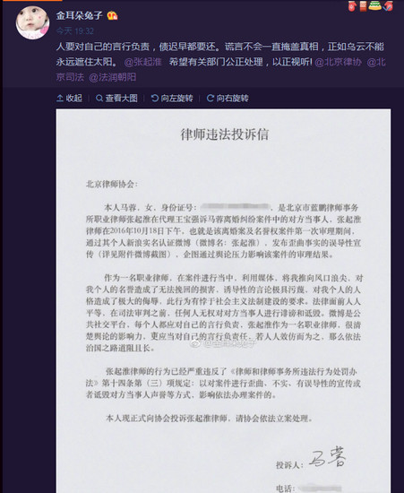 马蓉微博晒出投诉信 2月7日晚,马蓉在微博上晒出一封“律师违法投诉信”及数张截图,称已正式向协会起诉王宝强律师张起准,直斥对方在微博上“发布歪曲事实的误导性宣传,企图通过舆论压力影响该案件的审理结果。”截至目前,张起准律师方面暂无回应。 微博中,马蓉表示,“人要对自己的言行负责,债迟早都要还。谎言不会一直掩盖真相,正如乌云不能永远遮住太阳。希望有关部门公正处理,以正视听!并晒出一封自己于2月7日向律师协会发出的“律师违法投诉信。” 她在投诉信中直斥张起准律师通过新浪实名认证微博,发布歪曲事实的误导性宣传,企图通过舆论压力影响该案件的审理结果。“在案件进行当中,利用媒体,将我推向风口浪尖,对我个人的名誉造成了无法挽回的损害,诱导性的言论极具污蔑,对我个人的人格造成极大侮辱,此行为有悖于社会主义法制建设的要求。” 马蓉晒出张起准去年微博转发截图 据后续截图所示,马蓉说的“发布误导性宣传”一事,是指张起准于去年十月在微博中转发了网友“林哥看天下”的微博。因为那条微博晒出疑似马蓉与宋喆的微信截图,在网络上曾引发关注,当时部分媒体曾据此报道“转发马蓉聊天记录 疑坐实出轨证据”,不过此事距今也已有近半年时间。 曾有媒体报道此事 马蓉还称,张起准行为已严重违反《律师和律师事务所违法行为处罚办法》,盼协会依法立案处理。