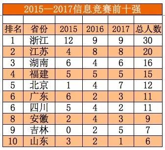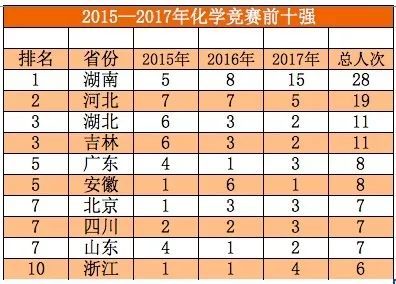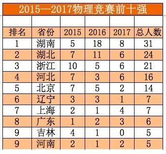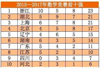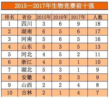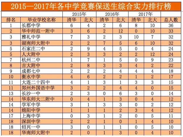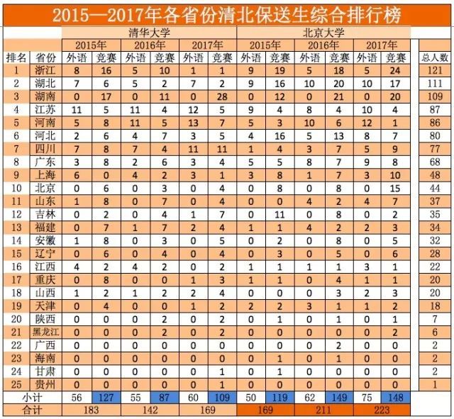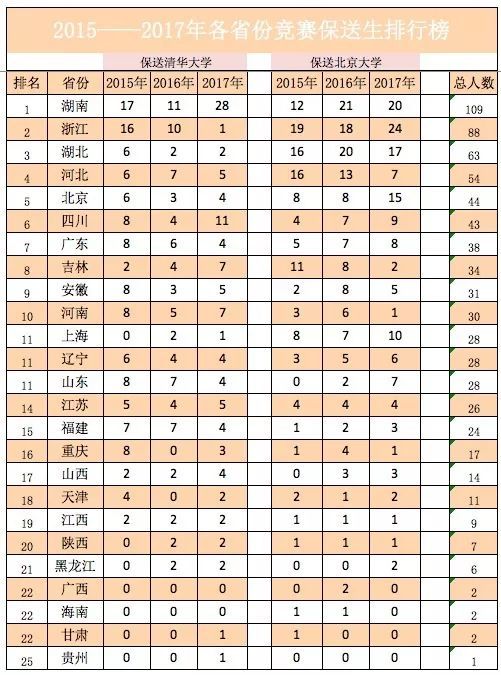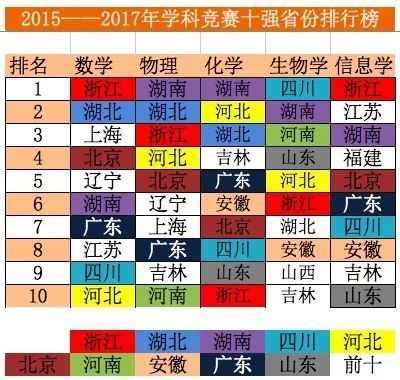 近日,阳光高考信息平台公布2018年保送生名单。内参君统计了2015——2017年各省份保送清北的保送生状况,各省份竞赛生保送清北状况,发现如下规律: 1.虽然保送生为五类资格,但实际上清华北大只认两类保送生。每年的国家集训队人员,全部被保送清北。 2.两类保送生中,竞赛类保送生占比明显高于外国语类保送生的占比,且呈现上升趋势。 3.竞赛能力最强的省份,基本等同于保送生综合实力最强的省份。 4.湖南是竞赛能力最强的省份,领先于第二名浙江省。 5.长郡中学、华中师范第一附中、雅礼中学、湖南师大附中、石家庄二中、人大附中、杭州二中、吉大附中、成都七中、衡水中学竞赛生综合能力十强。 保送生哪省强? 各省份清北保送生综合排行榜 清华北大,包揽了全部的集训队队员,在竞赛保送生的生源争夺上北大强于清华。 竞赛保送生哪省强? 各省份竞赛生保送清北排行榜 1.湖南是竞赛能力最强的省份,领先于第二名浙江省。 2.历年第一、二、三名的省份,揽括了竞赛生一半左右的名额。 3.湖南、湖北、浙江为竞赛生保送第一梯队,近几年来河北、四川进步非常明显。 学科竞赛哪省强? 1 2015—2017数学十强省份 2 2015—2017物理十强省份 3 2015—2017年化学十强省份 4 2015—2017年生物十强省份 5 2015—2017年信息十强省份 6 2015—2017年学科竞赛十强省份排行榜 学科竞赛十强省份排行榜 1.物理、化学是最容易拉开差距的两大学科,这两大学科第一名均为湖南,与第二名河北、湖北的差距非常明显。 2.数学和生物两大学科竞赛竞争比较激烈,前三名之间的差距并不是很明显。 3.浙江在信息学上独占鳌头,是由于浙江的某些学校举全校之力大力推进信息学的教学,这种经验其他竞赛弱省可以借鉴效仿。 竞赛保送生哪家中学强? 2015—2017竞赛保送生综合实力前20强中学 1.长郡中学、华中师范一附中、雅礼中学、湖南师大附中、石家庄二中、人大附中、杭州二中、吉大附中等8所中学竞赛保送生超过20人,为第一梯队中学,第一梯队和第二梯队差距明显。 2.第一梯队4所中学,湖南独占三所,这得益于湖南在物理和化学两大学科上的绝对优势。 3.人大附中这几年进步非常明显,17年成绩喜人。 本文数据综合整理自网络, 如有错误,敬请批评指正,是为谢!