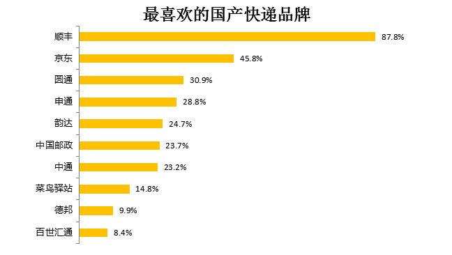 【环球网综合报道】随着国民消费能力的提高和市场上商品的多样性日益提升,各类品牌或大放异彩,或备受争议。国产品牌的发展历程,一直是我国经济社会发展的一个缩影。而近年来,民众心目中国产品牌的质量如何?国产品牌是否受到了民众的认可?是否让民众愿意为其消费?这些疑问都需要通过社会调查进行了解。 为了解中国消费者对国产品牌的认知情况,2018年初,环球网联合环球舆情调查中心就国产品牌相关话题展开网民对国产品牌好感度的调查。本次调查于2018年2月9日-2月27日通过环球网、一点资讯、今日头条、UC、百度新闻、凤凰网等以在线调查的方式展开。 在国产快递品牌中,顺丰占据最受喜欢的国产快递品牌榜的榜首,87.8%的受访者表示最喜欢顺丰,这一水平遥遥领先于其他同行业品牌。京东的受喜爱程度位列第二,提及率为45.8%。圆通以30.9%的提及率位居第三。 受访者最不喜欢的前三大国产快递品牌为圆通、韵达和申通,提及率分别为30.7%、30.1%和27.5%。