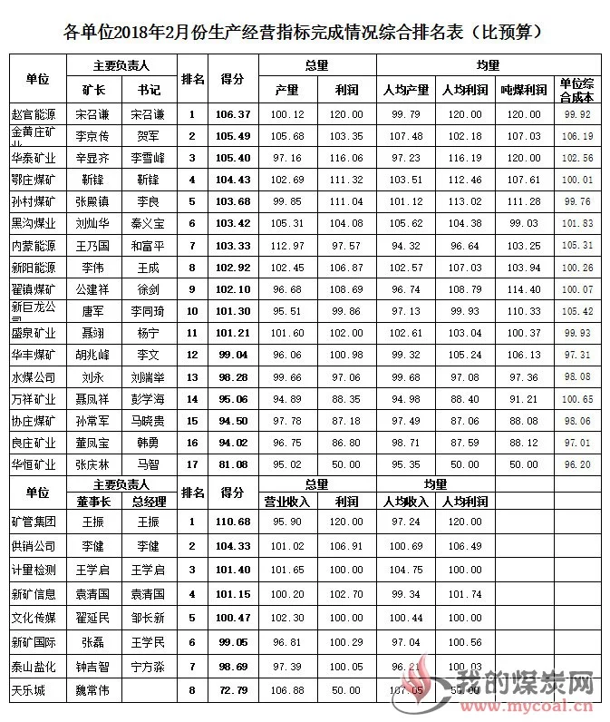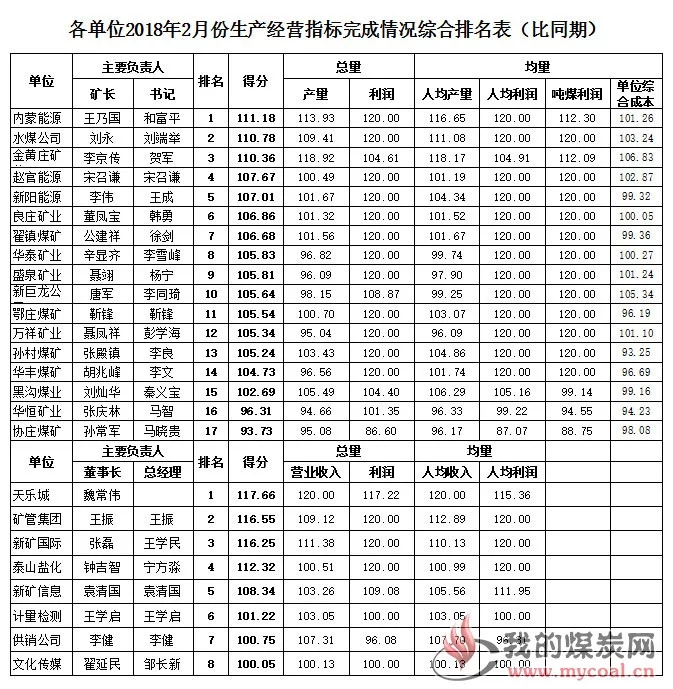 按照各单位2018年度自行提报的生产经营指标,集团公司将2月份产量、利润、营业收入以及均量指标完成情况进行了综合排名通报。 一、排名情况 (一)比自报指标 1.生产矿井2月份比自报指标综合排名前六位的单位分别是赵官能源106.37分、金黄庄矿业105.49分、华泰矿业105.4分、鄂庄煤矿104.43分、孙村煤矿103.68分、黑沟煤业103.42分,排名后三位的分别是华恒矿业81.08分、良庄矿业94.02分、协庄煤矿94.5分。 2.非煤单位2月份比自报指标综合排名前两位的单位分别是矿管集团110.68分、供销公司104.33分,最后一位的是天乐城72.79分。 (二)比同期 1.生产矿井2月份比同期综合排名前六位的单位分别是内蒙能源111.18分、水煤公司110.78分、金黄庄矿业110.36分、赵官能源107.67分、新阳能源107.01分、良庄矿业106.86分;排名后三位的分别是协庄煤矿93.73分、华恒矿业96.31分、黑沟煤业102.69分。 2.非煤单位2月份比同期综合排名前两位的单位分别是天乐城117.66分、矿管集团116.55分,最后一位的是文化传媒100.05分。 二、有关要求 (一)未完成利润指标的单位,月度基薪按欠目标比例同比例扣减核定的基薪标准。同时,集团公司党委将对综合排名生产矿井后三名、非煤单位最后一名的单位党政负责人予以约谈。 (二)各单位要对标得分较高的单位,从通报得分上找差距,切实加强内部管理,进一步梳理分解2018年度工作,确保完成全年任务目标。
