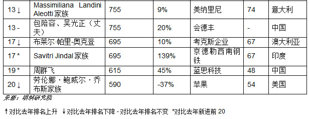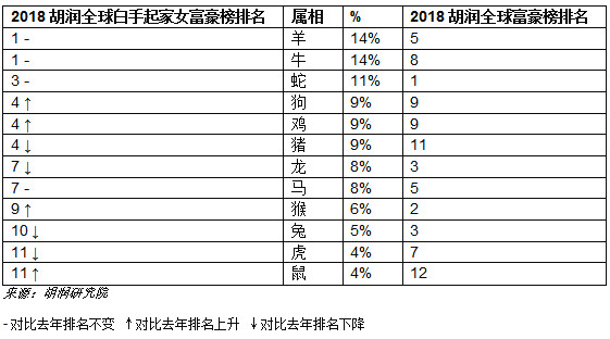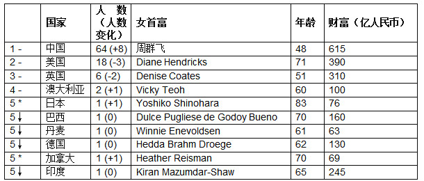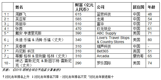 胡润解读《2018胡润全球白手起家女富豪榜》 制造业超越科技行业成为全球白手起家女富豪最主要的财富来源,以20人排名第一;房地产以16人排名第二;科技和零售分别以11人排名第三。胡润百富董事长兼首席调研员胡润表示:“这五年,全球最成功的女企业家主要都来自制造业、房地产和科技这三个行业。”在2018胡润全球富豪榜总榜的行业分布中,则是科技行业位列第一,房地产和制造业分列第二、第三;零售则排名第五。 平均财富155亿元,与去年相同。平均年龄58岁,比去年大一岁,比全球富豪榜的平均年龄小5岁。 46位上榜女富豪财富上涨,28位财富缩水或保持不变。另有28位新人上榜,表现最亮眼的是去年在香港上市的越南廉价航空VietJet的拥有者NguyenThiPhuongThao。 45岁或不到45岁的人数达10人,其中4位新面孔:芝加哥健康医疗科技公司Outcome Health的沙德拉·阿加瓦尔成为最年轻的上榜女富豪,年仅33岁;还有东华能源40岁的周一峰;昆仑万维41岁的李琼和大漠金海42岁的赵薇。 69%的上榜女富豪财富来源于其上市公司股份,比去年增加2个百分点。 上榜的17%女富豪财富与配偶共有,去年四分之一女富豪财富与配偶共有。 在2018胡润全球富豪榜上,女企业家占15%。三年前,这一比例为13%。五年前,这一比例为11%。 全球最大的财富榜排榜机构胡润研究院连续第八年发布“全球白手起家女富豪榜”。 (2018年3月8日,国际妇女节,上海)继2月28日发布《2018胡润全球富豪榜》(Hurun Global Rich List 2018)之后,胡润研究院今日发布其子榜《2018胡润全球白手起家女富豪榜》(HurunGlobal Self-Made Women Billionaires List 2018),统计了全球白手起家的十亿美金女富豪,上榜富豪的财富计算截止日期为2017年1月31日。这是胡润研究院第八年发布全球白手起家女富豪榜。 胡润表示:“全球最成功的男企业家百强中,有3成是中国的,而全球最成功的女企业家百强中,超过6成是中国的。中国女企业家比男企业家要‘成功’一倍。” 《2018胡润全球白手起家女富豪榜》—前十名 前十中一半来自中国,周群飞成为全球白手起家女首富。3人新进前十:美国最大屋顶与墙面批发分销商ABC Supply的戴安·亨德里克斯、“手机喇叭女王”瑞声科技的吴春媛,以及英国在线博彩公司Bet365的丹尼斯·科茨。 48岁的周群飞以615亿财富成为全球最成功的女企业家,财富比去年上涨45%。湖南人周群飞最初在深圳创业,从做手表玻璃起家,2000年开始做手机玻璃,跟着智能手机市场的发展,成为触屏行业龙头,几乎覆盖了所有的高端手机品牌,目前蓝思科技拥有8万多名员工。蓝思科技2017年度实现营业总收入237亿元,较上年同期增长56%。周群飞今年第一次担任第十三届全国政协委员。 54岁的龙湖地产掌门人吴亚军位列第二,财富上涨83%,达到585亿元。作为中国最早的购物中心开发商之一,龙湖从事商业地产运营已18年,发展于全国,业务涉及地产开发、商业运营、物业服务、长租公寓等领域。2017年龙湖销售额突破1000亿元,员工超过1.2万人。吴亚军曾担任第十一、十二届全国人大代表。 77岁去年全球最成功的女企业家陈丽华以510亿的财富排名第三。陈丽华的富华国际在北京拥有数家房地产企业,公司致力于房地产和紫檀艺术。1990年与唐僧扮演者迟重瑞结婚。陈丽华曾担任第八至十二届全国政协委员。 61岁的“造纸女王”张茵曾是2006年的白手起家女首富,今年排名第四,财富上涨49%,达到470亿。年轻时的张茵放弃了待遇优厚的工作,只身到香港闯荡,如今玖龙纸业规模庞大。张茵曾担任第十至十二届全国政协委员。 71岁的戴安·亨德里克斯是美国最大屋顶与墙面批发分销商ABCSupply的老板,财富上涨34%,以390亿排名第五。这位美国最富有的女企业家出生于美国威斯康星州。她和她已故的丈夫肯尼斯一起创立了ABC Supply。 朱迪·乐福与丈夫汤姆·乐福在1964年成立美国连锁加油站及便利店Love'sTravel Stops。财富340亿,排名第六。如今Love's已经有300多家店面。 瑞声科技吴春媛位列第七,财富上涨72%,达到310亿。从1993年开始创业,潘政民、吴春媛夫妇终于在声学专业领域打下了一片属于中国人的天地,缔造了一个手机喇叭为主的微型声学器材王国。2005年于香港挂牌上市,目前全球员工超过4万人。 51岁的丹尼斯·科茨是英国在线博彩公司Bet365的创始人,财富上涨24%,达到310亿,排名第七。2000年开始和她的弟弟约翰o科茨一起创业。 65岁的蒂娜·格林是英国零售品牌Arcadia创始人菲利普·格林的妻子,财富缩水19%,以310亿排名第七。蒂娜o格林最近在出售她的企业。去年他们一个子公司破产后爆出的养老金巨额亏空丑闻在英国影响重大。 74岁的琳达·雷斯尼克与丈夫斯图尔特一起创办Roll International。位列第十,财富比去年下降2%。旗下著名品牌有POM Wonderful、FIJI Water、WonderfulCitrus、WonderfulOrchards和Wonderful Pistachios等。 其他上榜女性: 碧桂园杨国强家族的杨美容凭借博实乐以财富115亿元新上榜,博实乐已经成为全球三大教育集团之一。在中国也颇具知名度的时尚品牌Tory Burch的创始人以财富88亿元新上榜,珠宝品牌潘多拉的丹麦联合创始人温妮·埃内弗德森财富63亿元。印度唯一一位上榜的白手起家女企业家KiranMazumdar-Shaw财富上涨88%,达到245亿元。 《2018胡润全球白手起家女富豪榜》—国家分布 中国以64位上榜女企业家位列第一,美国、英国分列第二、第三位。 《2018胡润