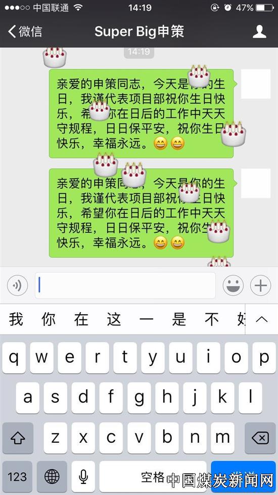 ![]() 据悉,今年四月初开始,澄合华宇公司在基层各班组间开展了“职工生日送祝福”活动,各班组自行建立本班组人员信息库,包括职工姓名、电话、出生日期等,认真编写安全祝福信息文本,在每一名职工生日当天以短信的形式送上安全祝福,进一步提高职工的安全意识。 ![]() “一条祝福短信虽然代表不了什么,但是这是班组这个“大家庭”的一份心意,可以将干部职工的心紧密连接在一起,使大家感受到安全重要性,体会到领导的重视和同事的关心,激励大家爱岗敬业,时刻紧绷安全弦,为澄合华宇公司安全生产贡献力量。”党群工作部部长宿建梅说。