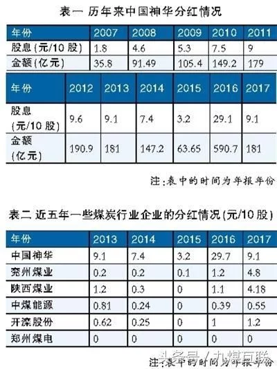 受需求及煤炭行业调结构、去产能的影响,2017年全年煤炭价格处于历史高位,煤炭企业也因此迎来了业绩靓丽的一年。煤炭行业主要企业纷纷实现业绩和盈利的大幅度增长,平均涨幅在40%以上。相关企业也在2017财报中竞相披露拟分红情况,如兖州煤业拟每10股派息4.8元(含税),陕西煤业拟每10股派息4.18元(含税)等。但其中最引人注意的无疑是中国神华,3月24日,其在年报中披露,拟向股东派发每10股9.1元(含税)的股息(即分红),该分配方案已经神华董事会通过。这是继2016财年神华给股东派发每10股4.6元(含税)的同时,又派发每10股25.1元(含税)的特别股息之后,再次大手笔派息。