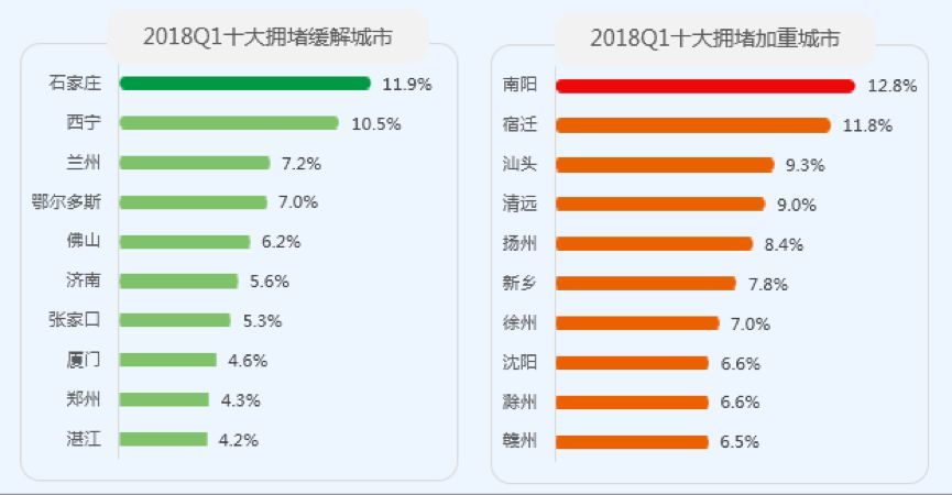 近日,交通运输部规划研究院、高德地图等联合发布《2018一季度中国主要城市交通分析报告》。报告显示,我国主要城市拥堵趋势持续下降,一季度仅有18%的城市通勤高峰受拥堵影响。在“中国堵城排行榜”上,银川、济南、洛阳分列“堵城”前三名。 此外,报告显示,网约车补贴大战也加剧了交通拥堵,上海市网约车补贴大战期间,上海同期早高峰拥堵指数创近四年新高。 近六成城市拥堵同比持平或下降 报告显示,2018年第一季度,仅有18%的城市通勤高峰受拥堵影响,其中15%的城市通勤高峰处于拥堵状态,3%的城市通勤高峰处于严重拥堵状态,18%的城市不受影响,64%的城市缓行。 从地域分布来看,成渝及周边、湖北、贵州、湖南西部、四川东部和东北部分城市,一季度拥堵相对较高;长三角和西部城市相对较为畅通。 与去年同期相比,总体来看,近六成城市拥堵情况处于持平或下降趋势,说明各地治堵持续生效,其中石家庄拥堵同比下降最大,降幅为11.9%。当然,也有部分城市拥堵同比上升,南阳拥堵同比上升最高,涨幅达12.8%。 中国堵城排行榜:银川跃居首堵 本季报告还公布了最新中国堵城排行榜,TOP10依次为银川、济南、洛阳、北京、呼和浩特、赣州、合肥、哈尔滨、茂名、汕头。其中,银川力压老牌堵城济南,成为第一季度首堵,北京、上海、广州、深圳一线城市排名下降,洛阳、赣州、茂名、汕头、合肥等大、中型城市排名上升。 上海网约车补贴大战期间 高峰拥堵指数创近四年新高 报告显示,今年一季度,上海3月末至4月中旬拥堵异常,高峰拥堵延时指数从2015年的1.86增长到1.97,成近四年历史同期最堵。同时发现,上海在5公里以内出行比例明显上升,早高峰约增加了10%,晚高峰增加了2%左右。 从24小时拥堵分布来看,2018年3月21日-4月10日期间,上海全天各时段较近四年均有加重,其中早高峰涨幅明显,早高峰平均拥堵指数比2017年早高峰均值加重8.1%,而平峰和夜间指数涨幅最高。 值得注意的是,上海市这一异常拥堵时段正逢网约车平台上演补贴大战。今年3月21日美团打车大幅补贴上海市场,每个用户前3单最高可享减免14元,短短上线两天即达成每日30万单的高峰,随即竞争对手滴滴立刻跟进,双方展开了新一轮的打车补贴大战。在美团、滴滴掀起“价格血战”约半个月后,滴滴方面14日宣布,率先取消上海地区的常态化补贴,至此美团、滴滴补贴大战熄火。 济南早高峰最堵 洛阳节假日最堵 本次报告还分别对早、晚高峰最拥堵城市进行了排名。早高峰拥堵排行榜中,排在前三的依次分别是老牌堵城济南、哈尔滨、北京。晚高峰拥堵排行榜中,银川、汕头、洛阳位居前三,都是大、中型城市,老牌晚高峰堵城广州排名第六。 ▲图文无关(图片来源:摄图网) 从地域分布来看,早高峰拥堵城市多数为北方城市,上海成唯一上榜的南方城市。排在第一名的济南虽然依旧占据首位,但拥堵同比下降了3.6%。 此外,节假日拥堵最高的城市为