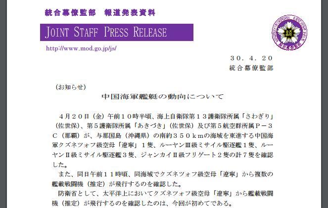 日本防卫省称,4月20日约10点半发现辽宁号航母编队前出西太 海上大阅兵资料图 4月20日有2架轰-6,朝中大陆东南方飞越宫古海峡后转西南方飞行,类似过去的绕台线路。 4月20日有2架轰-6绕台 4月20日有2架轰-6,朝东南方飞越宫古海峡后转西南方飞行,类似过去的绕台线路。 与那国岛和宫古岛的位置 近期我航母编队的大致线路(推测) 歼-15十机同框,战力不可同日而语。 【环球军事报道】辽宁号航母编队这次显然惊到了日本!日本防卫省20日配照片发布消息称,4月20日约10点半,日本海上自卫队“泽雾”、“秋月”号两舰以及P-3C巡逻机在与那国岛南约350公里看到辽宁号航母编队(052D驱逐舰1艘154厦门舰、052C驱逐舰3艘:150长春舰、151郑州舰和152济南舰、054A护卫舰2艘:538烟台舰和547临沂舰)。不仅如此,日本防卫省还有重大发现,防卫省“推定”:当天上午11时许,中国航母的舰载机升空,日本认为这是中国航母舰载战斗机在太平洋的首次飞行。 据台湾“中央社”的报道,台“国防部”称,辽宁号航空母舰编队19日晚间通过巴士海峡,然后向东航向西太平洋,执行远海训练。另外,20日也有2架轰-6轰炸机,朝东南方飞越宫古海峡后转西南方飞行,类似过去的绕台线路。 报道称,正值蔡英文“出访”,解放军除了18日在台湾海峡进行实弹军演,军机也在18、19、20日接连出动运-8、轰-6、图-154等多型多架进行远海长航训练活动,路线均穿越宫古水道进入西太平洋,经巴士海峡后飞返原驻地。 根据此前报道,4月12日,中央军委在南海海域隆重举行海上阅兵, 48艘战舰、76架战机和1万余名官兵参加,随后,受阅部队随后迅即开赴训练海域,一场跨区实兵演练在海上全面展开。