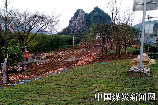 【本网讯】4月23日,宜宾路桥承建的兴文石海连接线景观工程开始铺设草皮,天空虽下着小雨,但现场施工人员却冒着小雨仍然继续施工,为顺利完工做最后的冲刺。