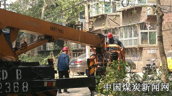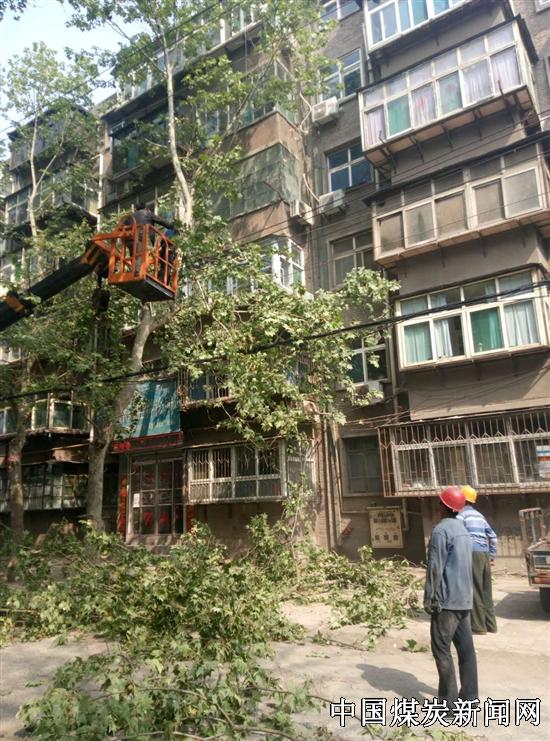 峰峰集团后勤实业分公司及时清除树障隐患,确保了在强降雨来临时减少因树木断枝倾倒引起的断线停电事故的发生。图为该公司水电科电工正在清理61#高压线路树障,保证了峰峰矿区新新小区居民安全供电。