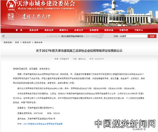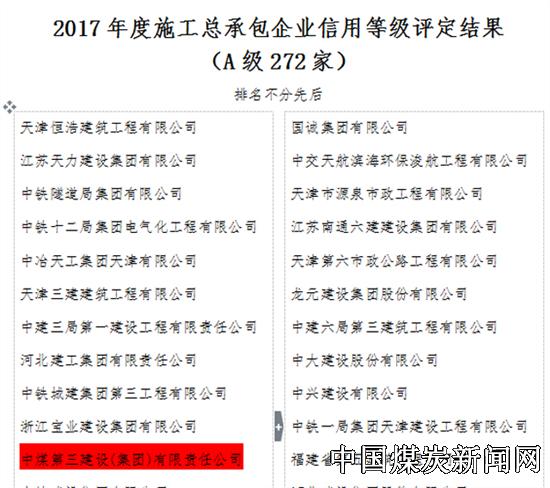 【本网讯】近日,从天津市城乡建设委员会传来喜讯,由中煤三建市政工程公司为主体负责申报,中煤第三建设(集团)有限责任公司再次荣获天津市2017年度施工总承包企业信用等级评定A级。