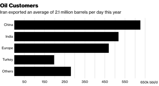 全球性商业风险咨询公司Control Risks的首席分析师亨利·史密斯称:“接下来几个月伊朗经济将举步维艰。难以找到其他突破口。唯一的机会是是否存在某种类型的机制来应对部分的二次制裁。” 经济学人智库中东和非洲版块的编辑主任普拉蒂巴哈·沙克预期伊朗将于明年陷入经济衰退。特朗普的目的在于摧毁一个已经很脆弱并且在协议签订后的两年时间里仅稍稍好转的经济体。 那些游说特朗普退出该协议的人们认为这种做法将对伊朗经济予以重创,从而可能削弱伊朗区域影响力,停止开发弹道导弹。伊朗领导人们曾表示,他们不会在安全问题上妥协,伊朗人大部分指责美国没有坚持自己花了几年时间磋商出来的协议。 以下是将受到影响主要经济领域: 石油,石油,石油 对政府收入的最大影响将来自于继美国给企业们180天时间退出伊朗能源行业后石油销售额有望减少。但是伊朗所承受的痛苦煎熬不可能与2015年以前制裁政权所承受的痛苦匹敌,因为这一次,美国将单干。 作为欧佩克第三大石油生产国,伊朗目前每天出口大约250万桶原油和凝析油,这个数字是2012年至2015年多方制裁最为严重时伊朗的销售石油数量的两倍多。目前的一份彭博社调查预测一旦美国再度采取制裁措施,伊朗每天出售原油量将减少50万桶。 下图反映了伊朗的主要石油买家,分别是中国、印度、欧洲、土耳其等。今年伊朗平均每天出口210万桶石油。