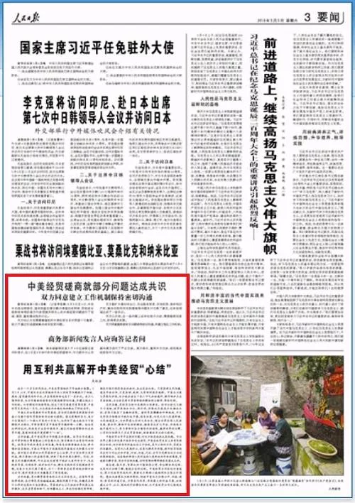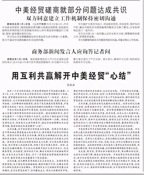 中美贸易谈判在5月4日结束,新华社的通稿的标题是: 中美经贸磋商就部分问题达成共识,双方同意建立工作机制保持密切沟通。 在通稿内文里,使用了这样的说法:"在有些领域达成了一些共识","在一些问题上还存在较大分歧","双方同意继续就有关问题保持密切沟通,并建立相应工作机制。" 由此可见,此次谈判的最大收获是:开始谈判了,承诺继续谈判。仅此而已。对此,我们的团队昨天在"TT财经"这个公众号上发文进行了初步分析(点击查看)。 翻看今天的《人民日报》,版面语言也是含义丰富,值得围观一下: 先看一下《人民日报》今天前三个版: