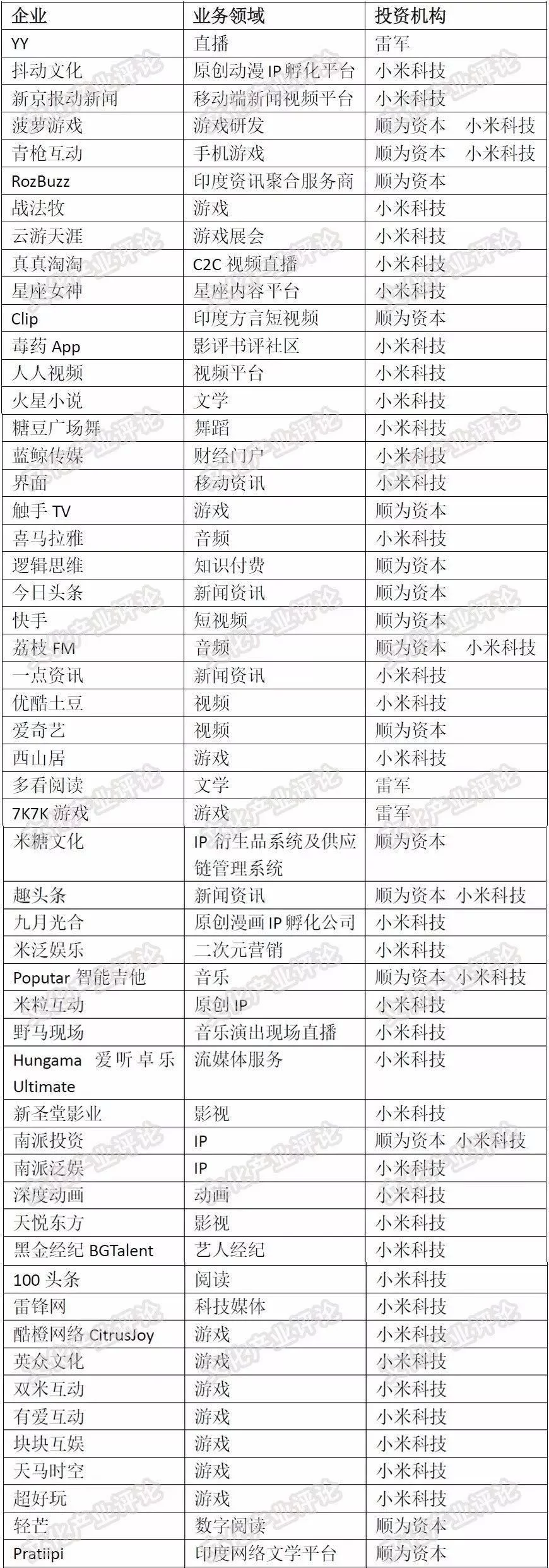 截止目前,IT桔子数据显示,小米投资已接近160多家企业,主要分布在硬件、文化娱乐等领域。2017年,小米共计投资8家文娱企业,交易金额总计6.55亿元,成为小米系产业布局第二大重点。 小米已经通过自身的投资布局,建立起文化娱乐企业大厦。据网上公开资料,小米参与投资的文化娱乐企业共有54家,涉及影视、动漫、媒体及阅读等10多个文化细分行业。围绕自身硬件布局内容,小米深入文娱产业链,已将触手伸向了游戏、视频、网文等领域。