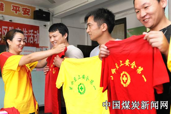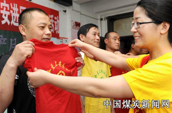 【本网讯】 6月6日,安徽淮北矿业朱仙庄矿妇女协安员正在为一线职工送上“安全文化衫”。该矿针对职工反映工作服厚重、透气性差、穿着不舒适的意见,立即购买5000件印有“生命至上、安全发展”字样的纯棉“安全文化衫”,为全体职工每人发放2件,受到了职工的一致“点赞”。