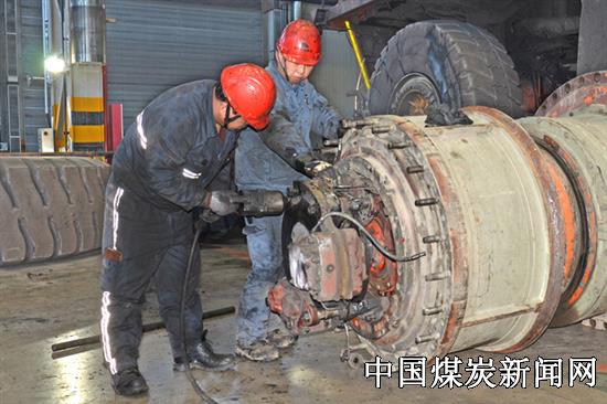 【本网讯】六月份以来,国家能源准能集团设备维修中心进一步加强设备管理,以问题为导向狠抓计划性检修和预防性检修,紧密盯控设备运行状况,全力保证设备故障发现的早、控制的住、处理的好。图为该中心职工正在处理卡车电动轮故障。