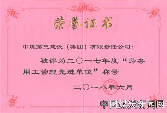 【本网讯】近日,从天津市施工队伍管理站传来喜讯,中煤第三建设(集团)有限责任公司荣获天津市2017年度建筑业劳务用工管理工作先进单位,这是公司连续两年荣获该荣誉称号。