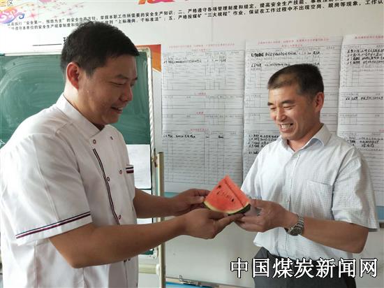一句句暖心的话语,一个个温馨、和谐、关爱的场面,呈现在一线区队会议室。粽子的清香在空气中弥漫开来,香甜的西瓜在职工舌尖上扩散出去,一个个粽子、一片片西瓜代表着后勤服务人员对一线将士的关心,也寄托了他们对安全生产的美好祝愿。
