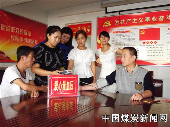 【本网讯】今年以来,冀中能源峰峰集团电业分公司供电工区工会服务职工不断线,他们利用工作之余为职工量血压、测血糖等爱心服务活动受到职工们好评。图为该工区职工们正在互量血压时的情景。